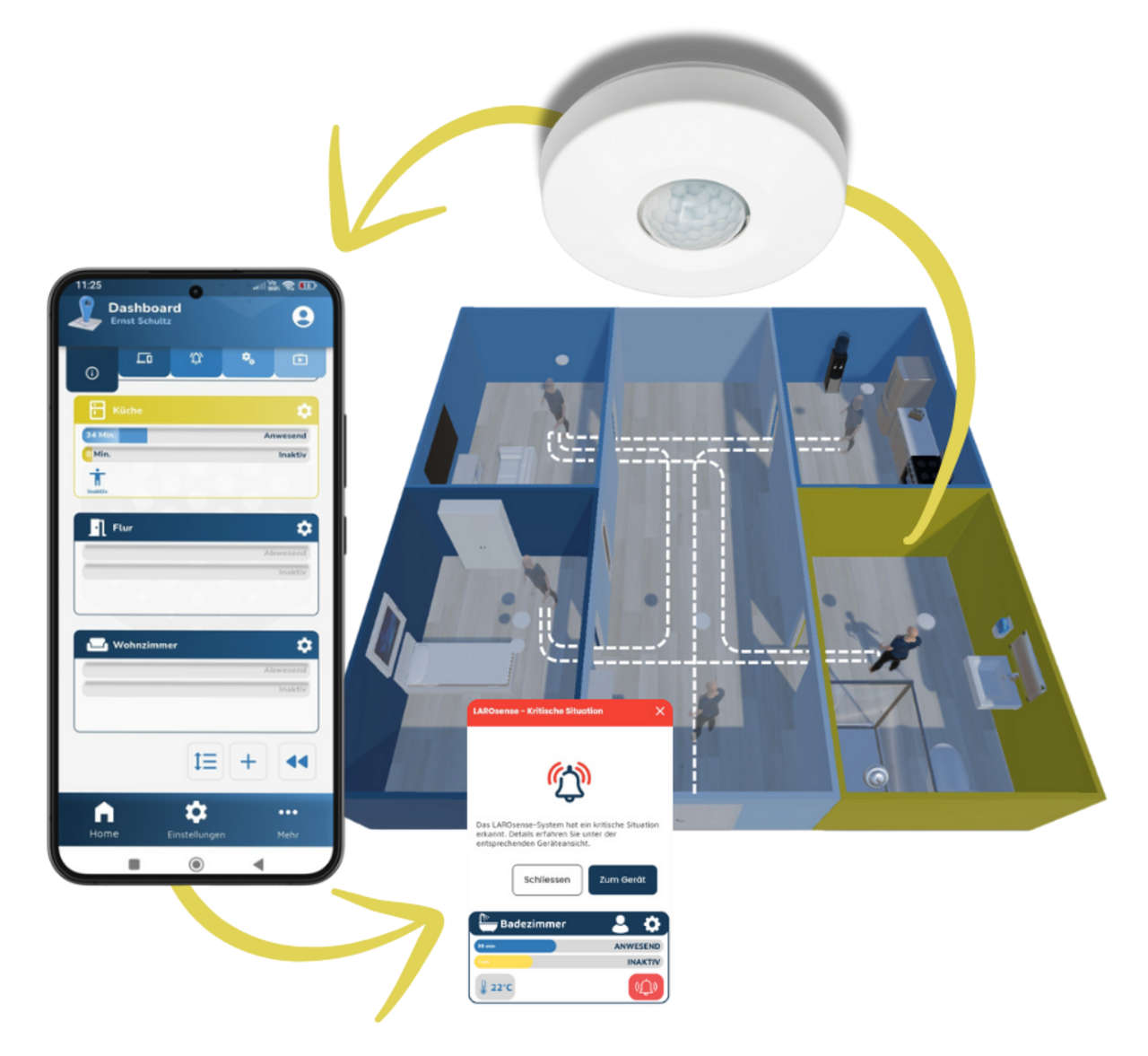 Die LAROMED IQ-ROOM Lösung bietet ihnen rund um die Uhr einen Überblick über die Anwesenheit - und Inaktivitätszeit in den Wohnräumen. Ungewöhnliche Situationen können automatisch vom System erkannt werden und sie schneller informieren.
