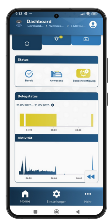 LAROsense Sleep ONE bietet ihnen rund um die Uhr einen Überblick über den Belegstatus in den Zimmern. Bettabwesenheiten und Ausstiege zu ungewöhnlichen Zeiten und besonders während der Nachtphase werden schnell erkannt und Sie schneller informiert.